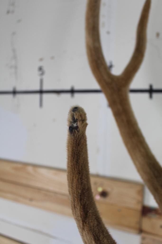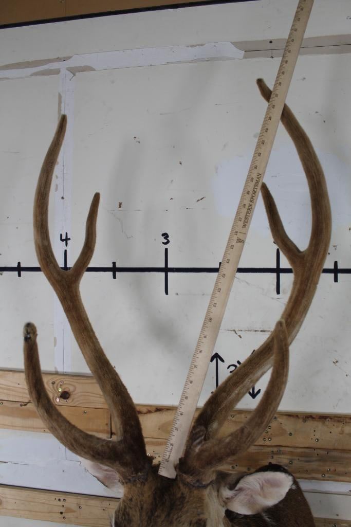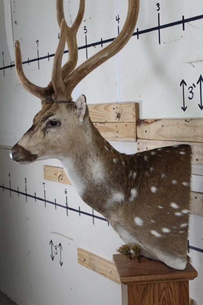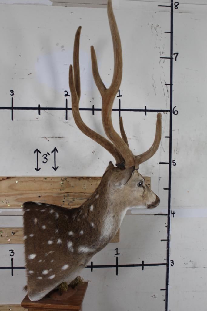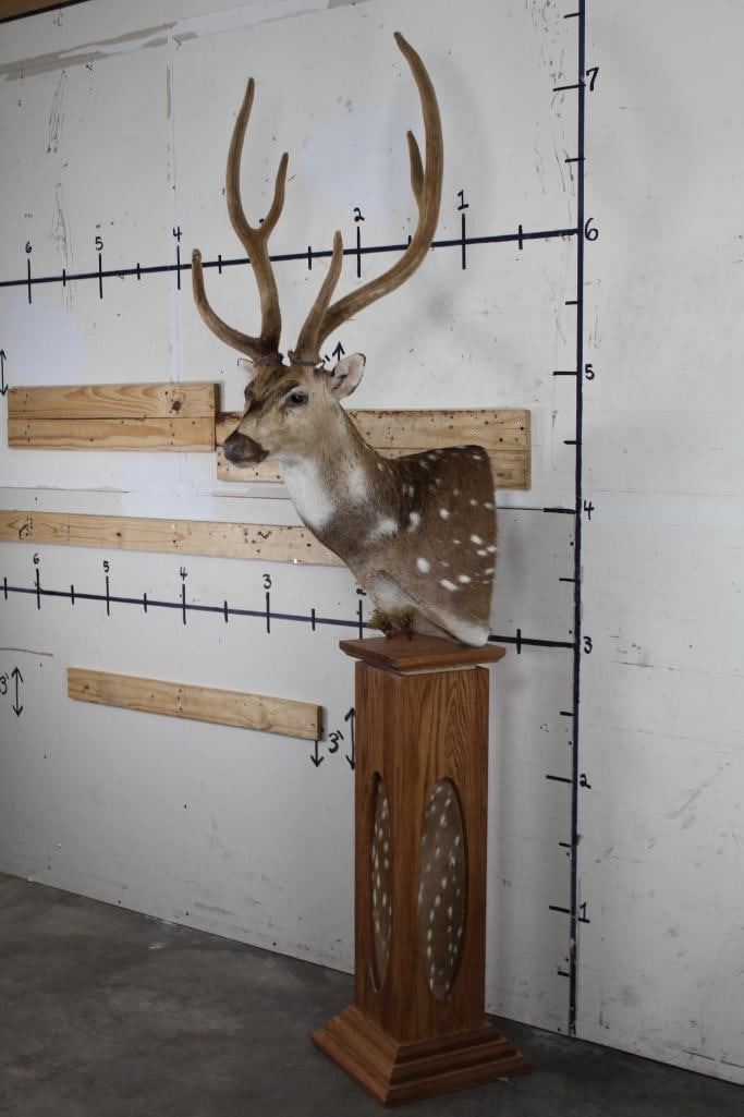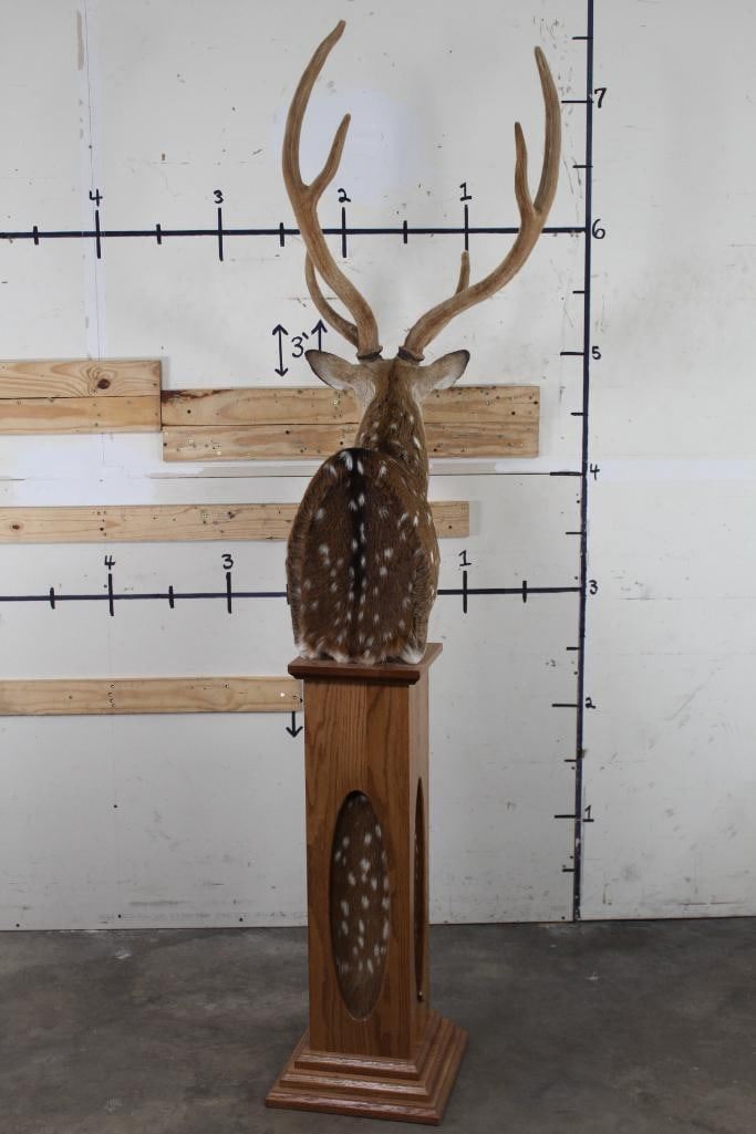 Very Nice and Newer AXIS DEER Pedestal Mount In Velvet. The Rack measures 28" Tall and has a 23" Spread. The Wood Pedestal Measures 36.5" Tall x 14.5" Width x 14.5" Depth and has Axis Hide on All Sides. The Axis is Removable and the mount is in Very Good Condition. TAXIDERMY