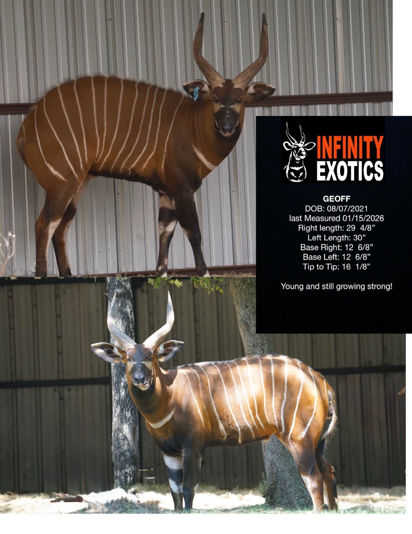 Last Measured 1/15/26 : Right-29 4/8" Left 30" Base Right- 12 6/8" Base Left- 12 6/8" Tip to Tip- 16 1/8" Young and still growing strong.