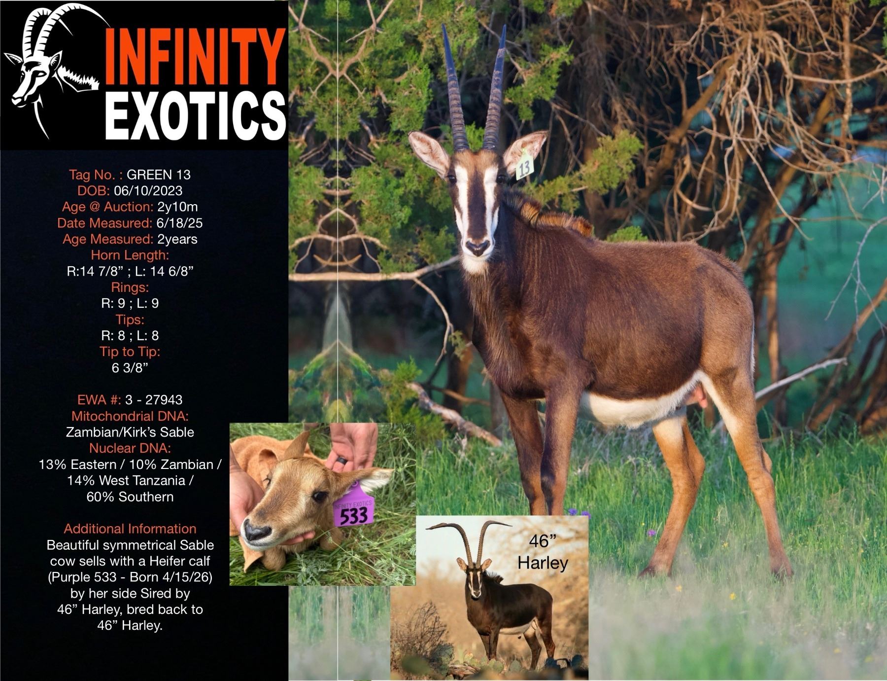 Infinity Exotics presents one mature Sable cow born in 2023 (Green 13) with a Spring 2026 heifer calf sired by Harley. Mature Female will be bred back to Harley with delivery postponed until late 2026. All arrangements and agreements will be between the buyer and Infinity Exotics.