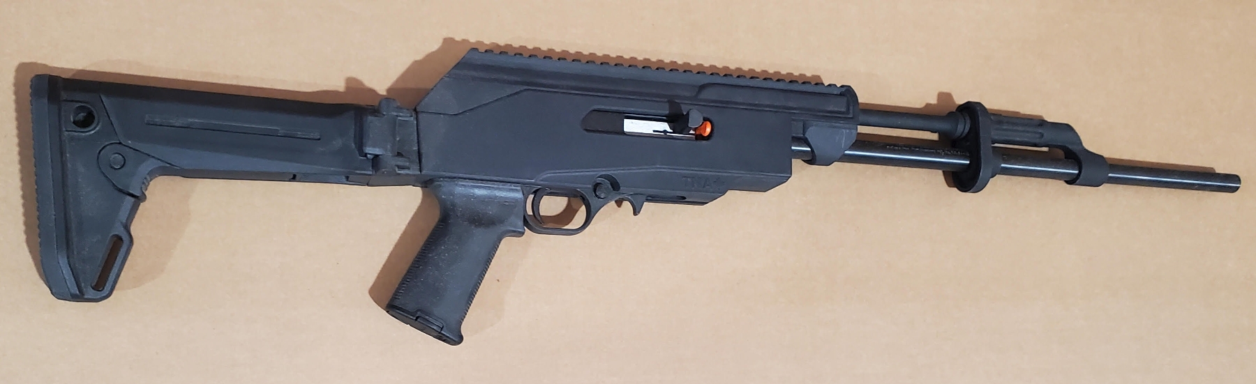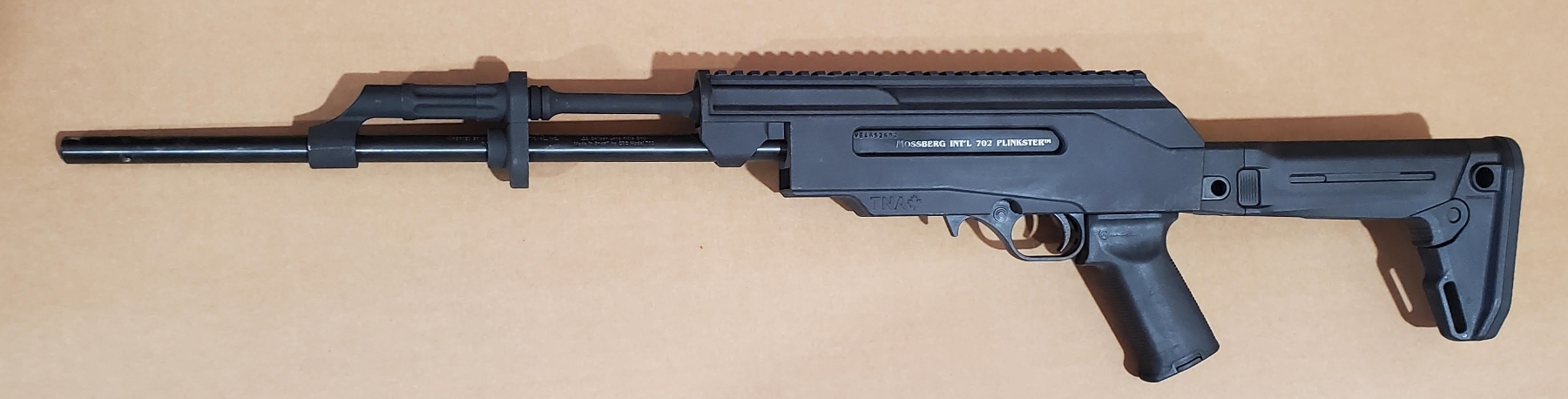 a mossberg plinkster that has had a custom prototype chassis put on it to resemble an AK. Has a magpul zhukov stock and a magpul pistol grip. The handguard is missing. Takes regular short AK style handguards.